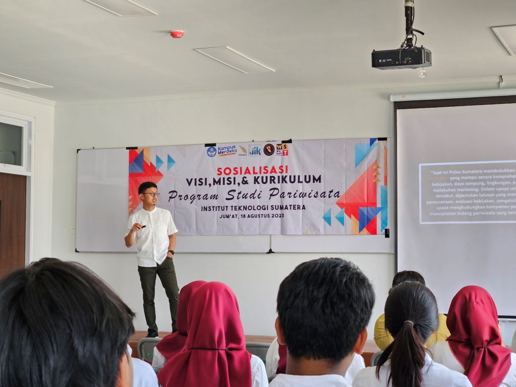 Jumat, 18 Agustus 2023 bertempat di Lantai 2 ruangan 206, Gedung Kuliah Umum (GKU) 2 ITERA, pemaparan penjelasan awal terkait program studi Pariwisata dilakukan oleh Asep Nurul Ajiid Mustofa, S.T., M.T. selaku Kaprodi. Baru berdiri di awal tahun 2023, diharapkan Prodi Pariwisata akan menciptakan sarjana pariwisata dengan beberapa keahlian yang akan mendukung perencanaan, pengembangan, dan pengelolaan pariwisata di Pulau Sumatera (tourism planning).